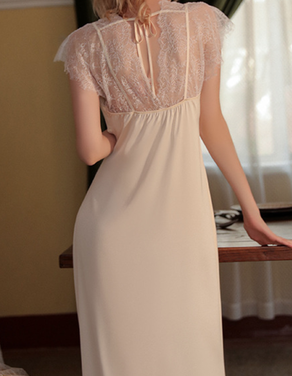Experience the charm of smooth satin and intricate lace in this romantic champagne nightdress. Designed for comfort and sophistication, it features delicate lace cap sleeves, a flattering V-neckline, and graceful flow for a timeless silhouette.