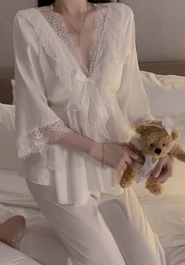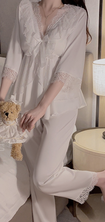 Indulge in soft luxury with this Elegant White Floral Lace Satin Pyjama Set. Designed with silky-smooth satin fabric, floral lace trim, and a relaxed feminine silhouette, this set brings together comfort and elegance for dreamy nights and cozy mornings.